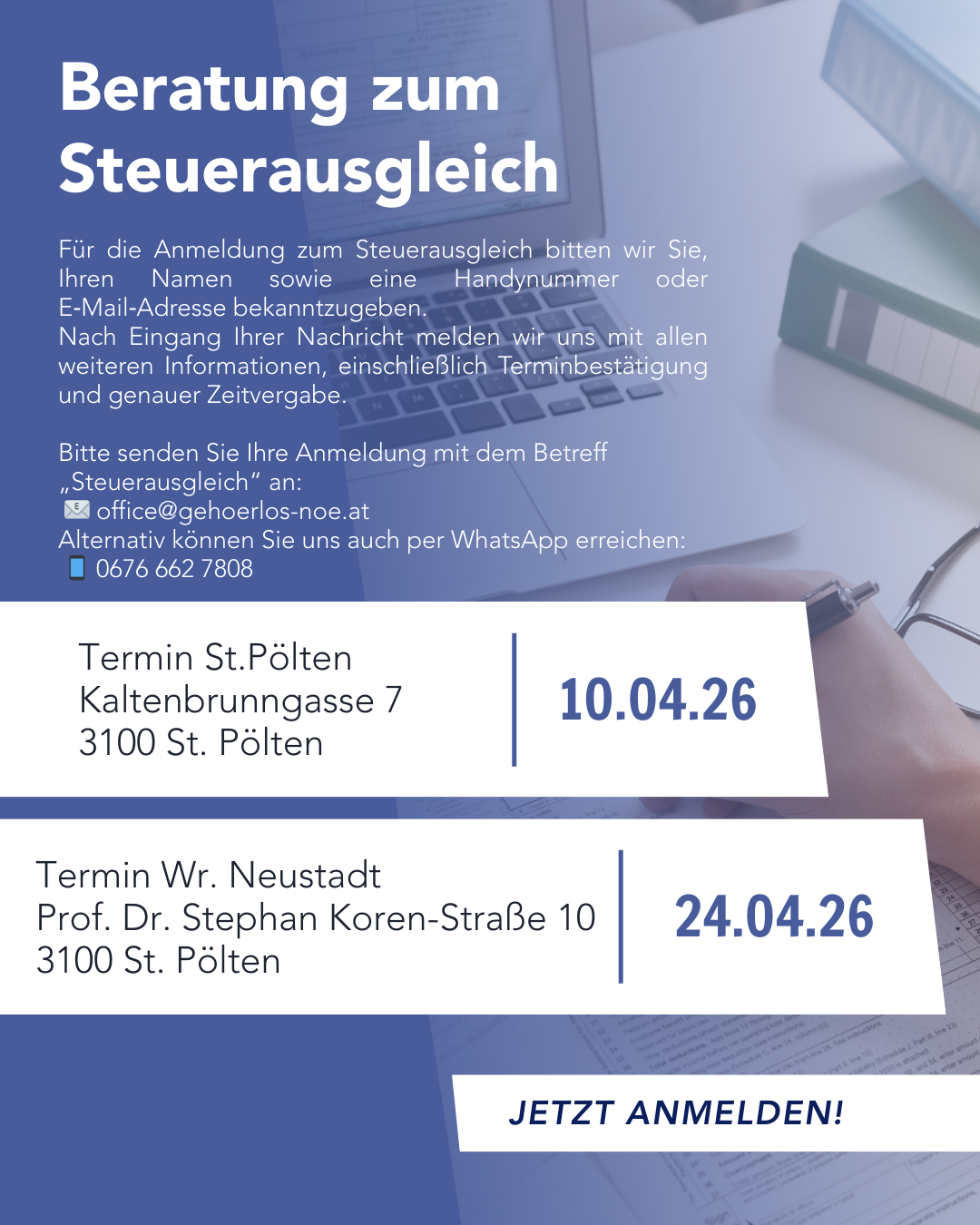 Bitte senden Sie Ihre Anmeldung mit dem Betreff „Steuerausgleich“ an: 📧 office@gehoerlos-noe.at